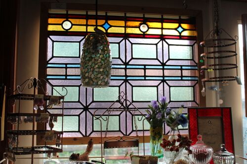 W66×H54(ガラス面のみの大きさです) 68000円 細かいピースがいくつも組み合された、手の込んだステンド上にレンズが2つはいっています