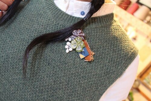 今日のお客さんの手作り。 革とお花のパーツでかわいいコサージュ。 グリーンのニットベストによく似合う。 もうお一人。モヘヤとAVRILの糸で編んだフワフワのマフラーに ビーズのボタンを選んで付けるそうです。 とっても素敵ですね。 あゆの着ているベスト…