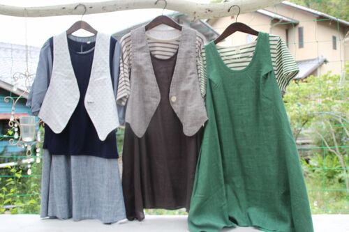 zappaワンピは前回完売した麻とレーヨンのたらっとした生地。 色は新色もあります。リバーシブルベストはリネンとレース。 袖たっぷりシフォンのカットソーにレースのベストを合わせました。 ベストは袖繰りがゆったりなので大きな袖の上にも羽織ることがで…