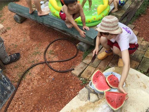 ゆきみです。 今日も暑かった〜!子どもたちは庭でプール。 冷えたスイカ美味しいね〜。 chezmoiのリネンスカート。 レースのブラウスとネパールの水牛バッグ。 裾にレース。 ピーチエンジェルさん。ご自分で作られたムササビポンチョのインナーに 裾レース…