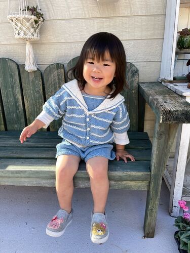 ゆきみです。 気持ちいいお天気の日曜日。 うーちゃんは私がだいぶ前にそうたのために編んだコットンのアンサンブルを着ています。 もう寒いと思うけど、今のうーちゃんにちょうど。お母さんが着せてたからまあいいか。 お尻にSOTAの文字を編み込み。 朝倉庫…