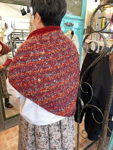 ゆきみです。 オパールの糸にダイヤの糸を混ぜて素敵なストールが仕上がってました。 リバーシブルスカートもお似合いです。 ストールをブランケットピンで留めておられます。 ブランケットピンは今完売していて製作中です。 レッグウォーマーも手編み。 い…