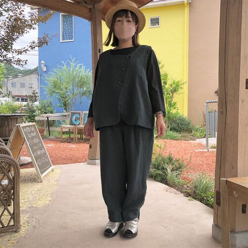あゆみです~ 今日は新商品のご紹介です♡ えりさんモデルでどーぞ♡ 9番手リネン前後着ベスト¥8,690 9番手リネンタックパンツ¥10,780 こちらは♀️グリーンのセットアップで着てまーす♪ お色は グレージュ/ベージュ/グリーン/インディゴ どちらが前でも着てい…
