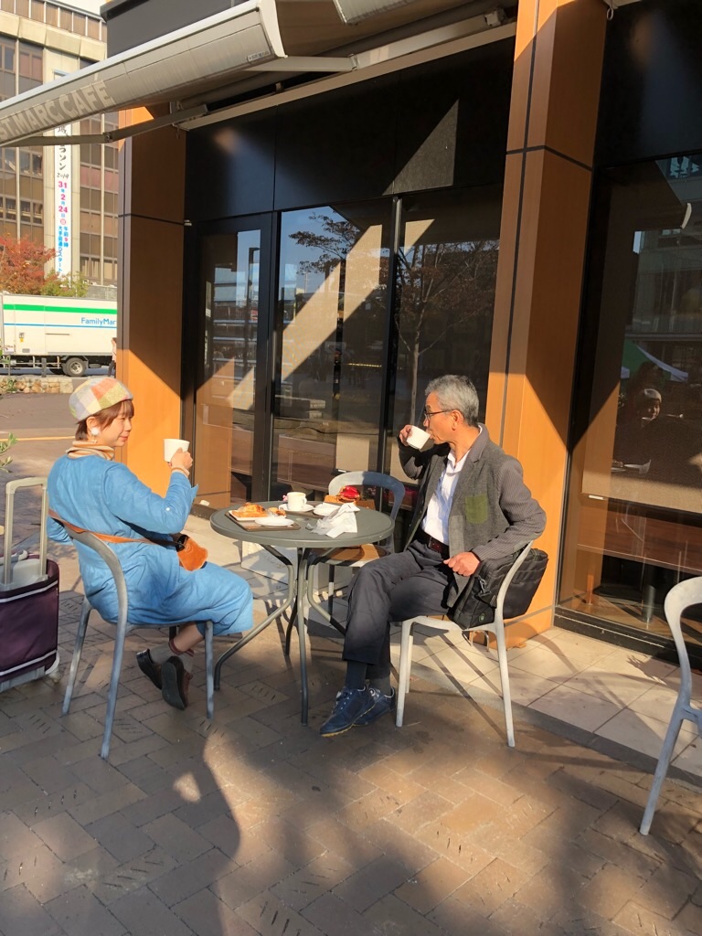 こんなこともめったにないし、早めに着いたので、気持ちいい朝日をあびながら駅前でコーヒータイム