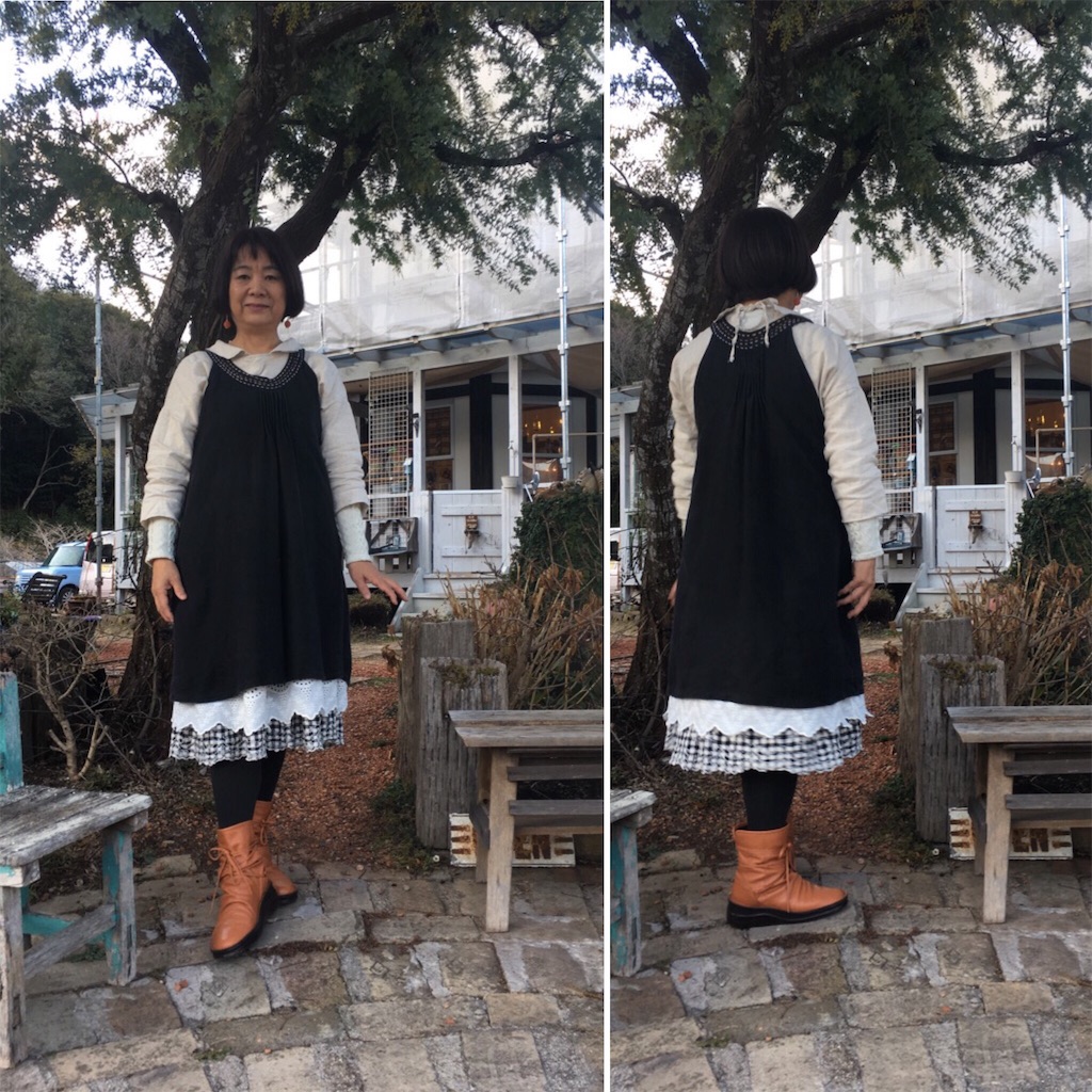 リネンワンピは昨日と反対に着ています。裾レースの見え具合がザッパワンピやドーナツワンピにぴったり。