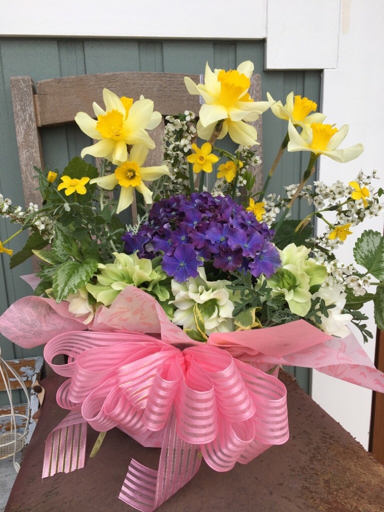 庭に咲いている水仙やクリスマスローズでアレンジフラワーをつくりました。