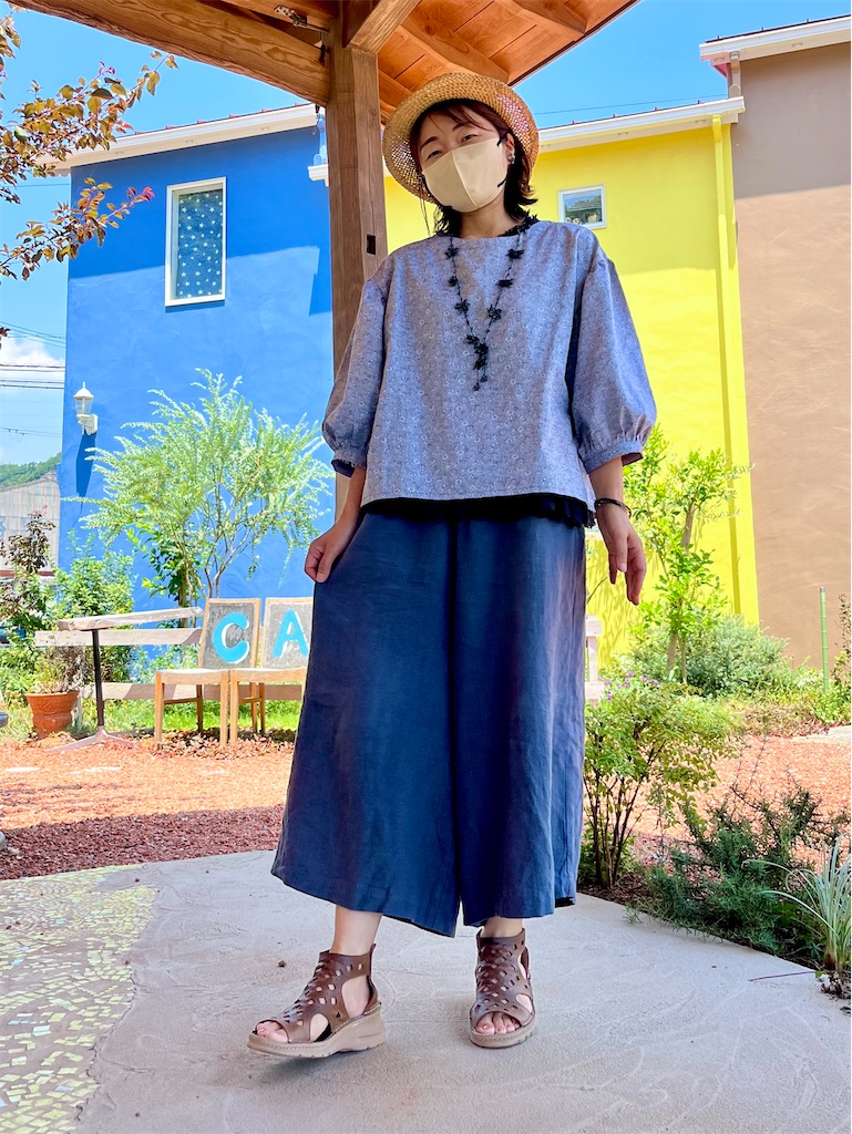 ジャガード小花の袖ぽわんブラウス¥8,360にブローチレースのタンクトップ¥6,380、今日もゆったりして涼しいと人気だったゴムタックの楽ちんリネンパンツ¥9,790。